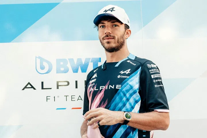 Pierre Gasly, driver for Alpine, wearing the H. Moser & Cie Streamliner Flyback Chronograph