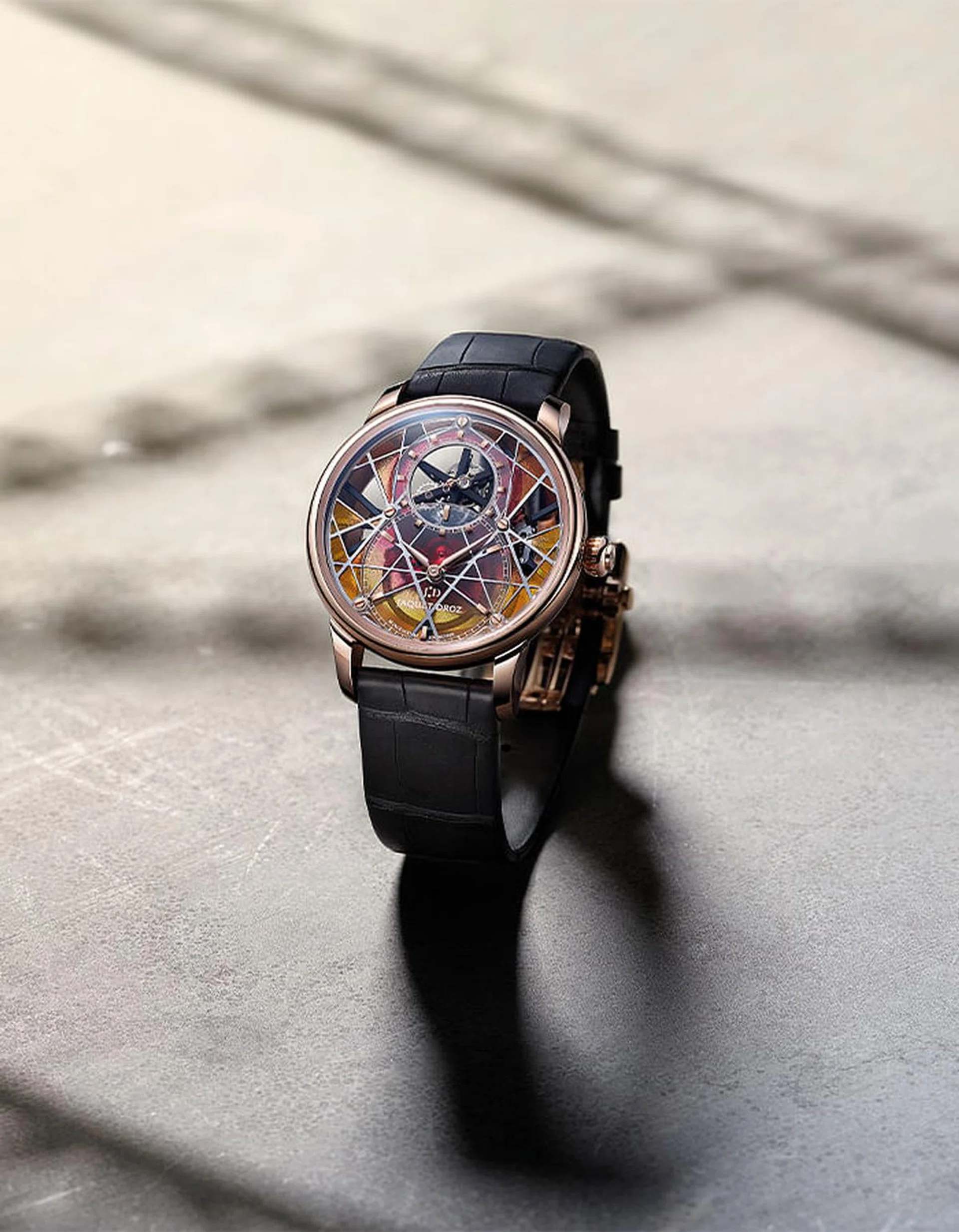 The independents usually have the most fun with this. Ludovic Ballouard’s offering looks like a miniature vinyl record and MB&F has transformed its already adorable HM10 Bulldog into a wrist- wrapping panda. Additionally, Jaquet Droz is proving that even the more traditional brands know a thing or two about spectacle. The Grande Seconde Skelet- One Tourbillon “Only Watch” (right) is a stunner. Gone are the soft curves of the regular Grande Seconde. This special edition uses plique-a-jour enamel in geometric shapes outlined in white gold to make a statement. Jaquet Droz chose the fiery stained glass-like colours to convey a mood of happiness, passion, optimism and energy – all things we could use more of, not just in the fight against this terrible disease, but in these trying times.