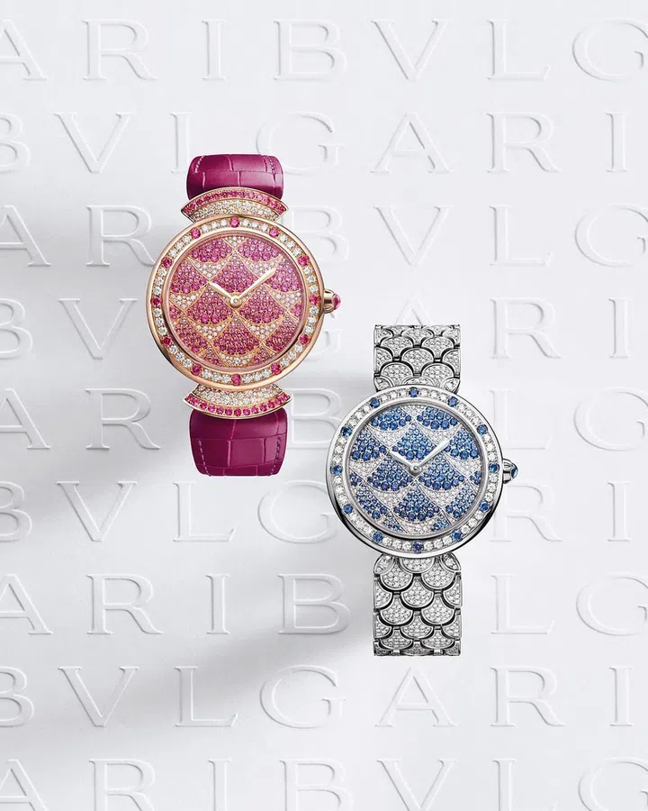 Distinguished by a fan-shaped pattern inspired by the mosaics decorating the ancient Baths of Caracalla, the Divas’ Dream Mosaica jewellery-watch collection welcomes two new additions. Alongside some 3.8 cts of brilliant-cut diamonds, the Divas’ Dream Mosaica features pink sapphires or blue sapphires on a fully gem-set dial, with the coloured gemstones arranged in a subtle gradient. The pink sapphire version comes in pink gold while the blue sapphire edition is made from white gold.