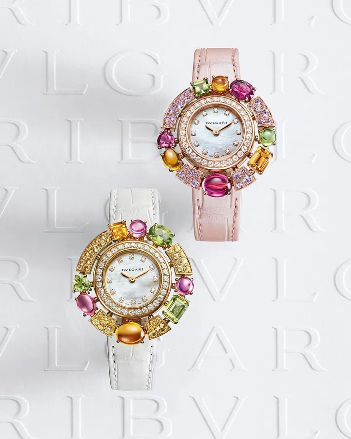 Powered by quartz movements, the 36mm timepieces come in rose gold or yellow gold versions that feature pink or yellow sapphires, respectively — as well as tourmalines, citrines, rhodolites and peridots. Each timepiece also features a bezel set with 32 brilliant-cut diamonds.