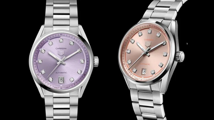 Rounding out the collection are two elegant pastel editions of the TAG Heuer Carrera Date. The 36mm models in powdery pink and lilac blend timeless sophistication with a playful, modern aesthetic. The sunray-brushed and snail-brushed dials, gradient track, and 11 diamond indexes add a touch of sparkle, while the updated Carrera H bracelet and Caliber 7 automatic movement ensure everyday wearability.