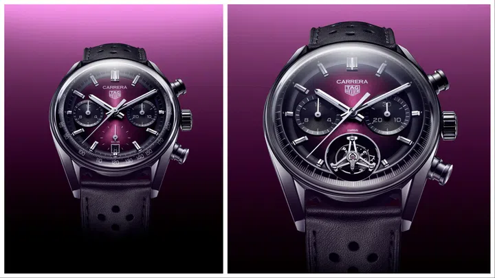 Offered in a new and attractive colourway of smoky black and purple are the TAG Heuer Carrera Chronograph, and Chronograph Tourbillon
