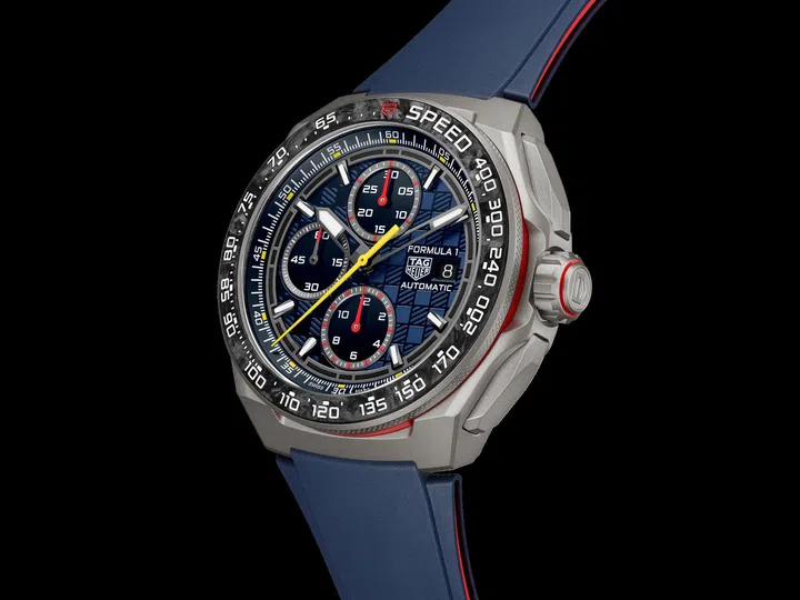 The 44mm watch features a grade-2 titanium case, a tachymeter bezel with a forged carbon insert, and a dial adorned with Oracle Red Bull Racing’s signature blue opaline finish and a checkered flag pattern. Other traffic-stopping elements include the red lacquer in the crown and the coloured ring between the case and bezel, which are complemented by the yellow lacquered central hand.