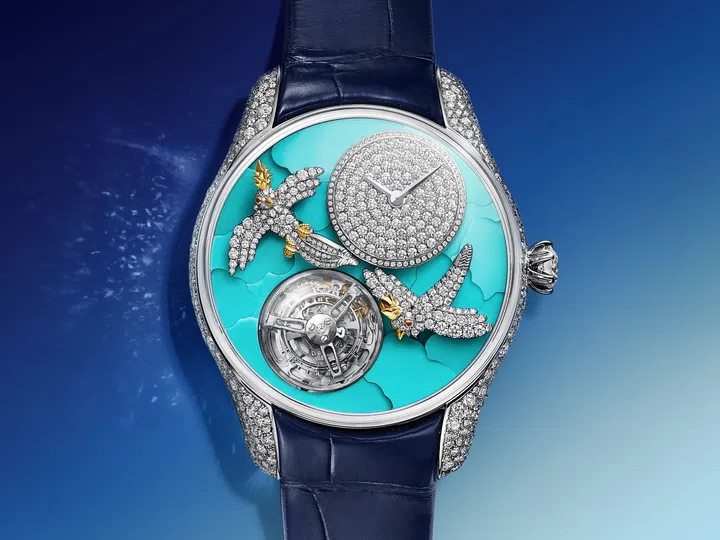 The 39mm white gold case houses a pure-blue dial of natural turquoise, sourced from the renowned Sleeping Beauty mine and cut into 16 cloud-like shapes through intricate gemstone marquetry. Adorning it are two gold-sculpted, diamond-studded birds in flight, evoking the whimsy and freedom central to Schlumberger’s vision, as well as a diamond-set sub-dial displaying hours and minutes.