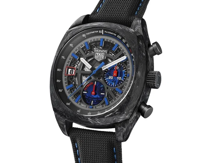 Introduced in 1976 to celebrate Niki Lauda’s F1 World Championship victory in 1975, the Heuer Monza was one of the first black-coated watches then. The latest special edition comes in a 42mm carbon case, as well as a skeletonised dial with blue applied indexes and two chronograph counters crafted from fumé blue sapphire crystal. The timepiece is driven by the brand’s in-house Calibre Heuer 02 Flyback, a COSC-certified chronograph movement.