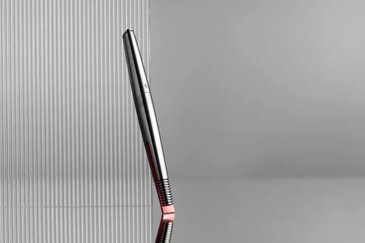 The cap, laser-etched with Ferrari’s iconic Prancing Horse logo, is also angled to resemble the racer’s nose, while lined accents along the barrel evoke the distinctive style of the car’s bumpers.