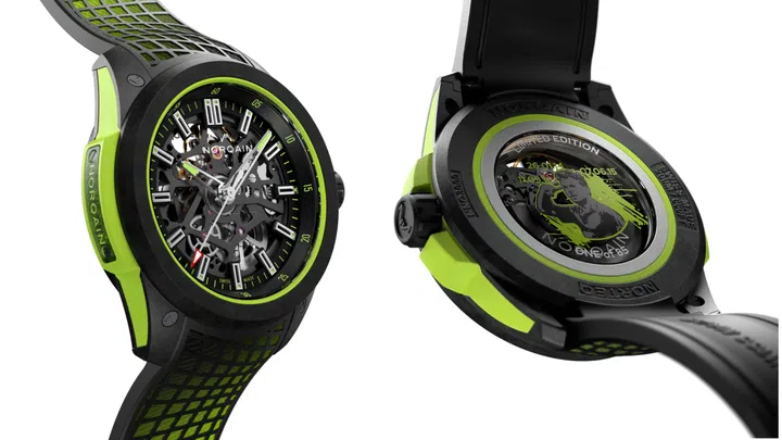 Up front, the skeletonised black dial opens onto the NORQAIN Calibre NB08S, a COSC-certified automatic movement with 41 hours of power reserve. Rhodium-plated hands and indexes are edged in Super-LumiNova and tipped in tennis’ signature yellow-green.