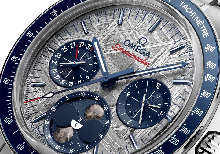 With the new Omega Speedmaster Moonphase, famed for its space exploration roots, you’d come within kissing distance of a meteorite dial sourced from the stars.