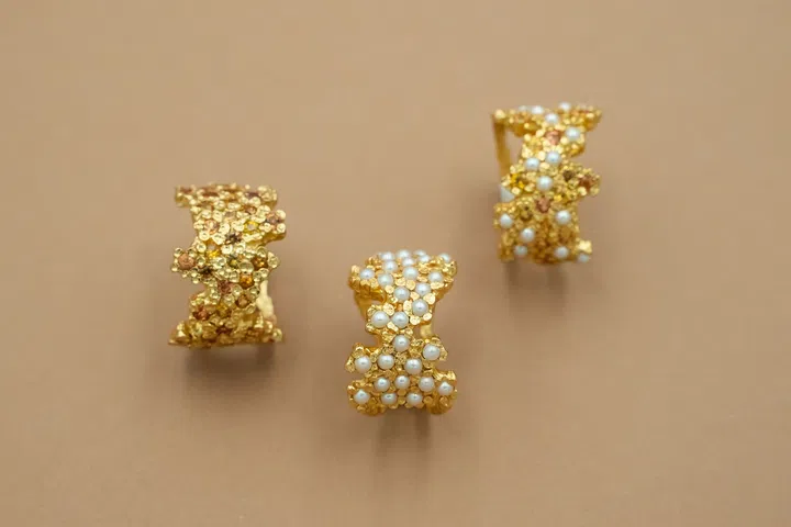 Pacharee’s pieces embrace the beauty of imperfection — freeform silhouettes with no sharp edges or defined shapes. They look as if they could have been discovered in the wild. Take, for instance, the brand’s hoop earrings: a hand-engraved gold setting opens slightly to reveal a row of abstract pearls, reminiscent of peas in a pod.