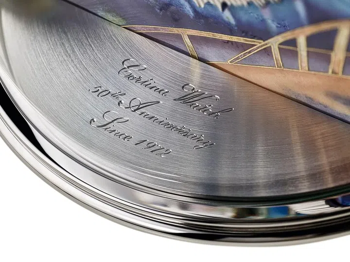 The watch's features are faithful to the original, with the date and moon phase, power reserve and seconds displayed on three subdials. The ultra-thin, automatic Calibre 240 PS IRM C LU is visible through the sapphire display caseback, which bears the inscription, "Cortina Watch — 50th Anniversary — Since 1972".