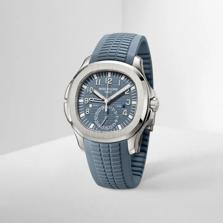 The Aquanaut Travel Time Reference 5164G-001 blends sporty chic with contemporary sophistication. Making its debut in white gold, this 40.8mm version features an opaline blue-grey dial embossed with the iconic Aquanaut pattern. The dial is beautifully matched by an integrated composite strap, which also carries the same subtle yet elegant hue.