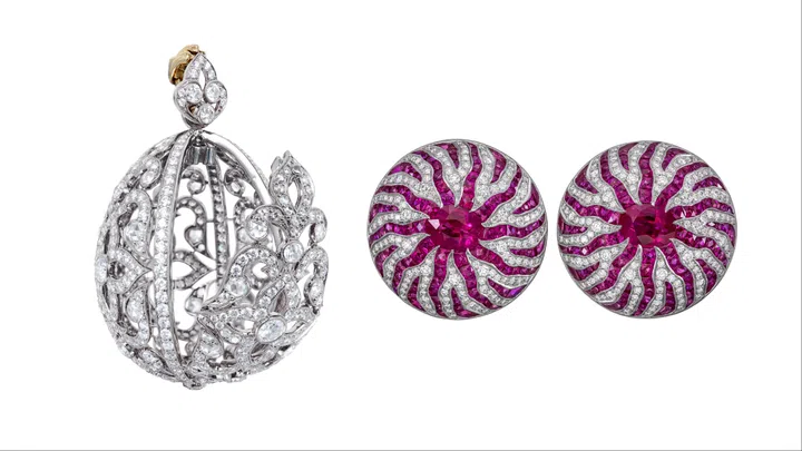An intricate diamond pendant, and a pair of ruby and diamond earrings, both from Chavana
