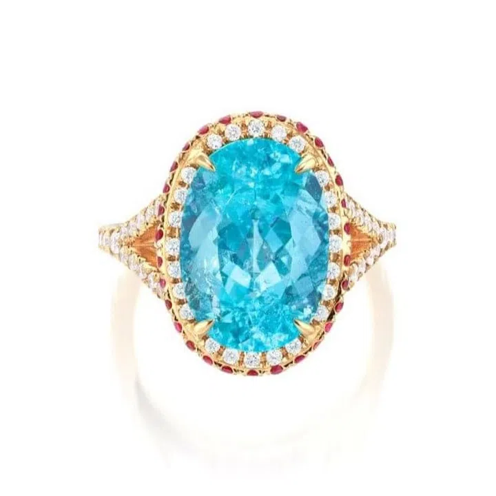 Approximately 6-carat Mozambican Paraíba Tourmaline Ring with Ruby and Diamonds (Credit: Phillips)