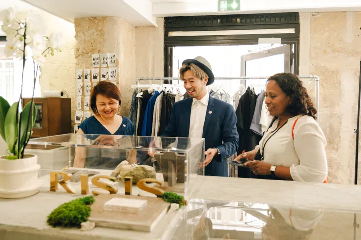 Her Excellency Foo Teow Lee (left), ambassador of Singapore to France, browsing the products with Singapore-based actor Ian Ketsumasa (centre)