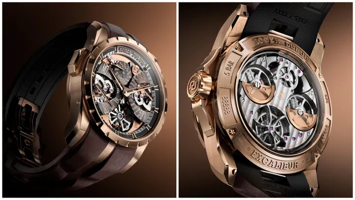 The Roger Dubuis Excalibur Grande Complication is a showpiece combining a perpetual calendar, a minute repeater, and a flying tourbillon