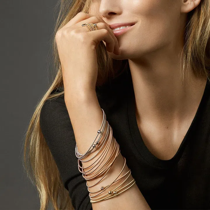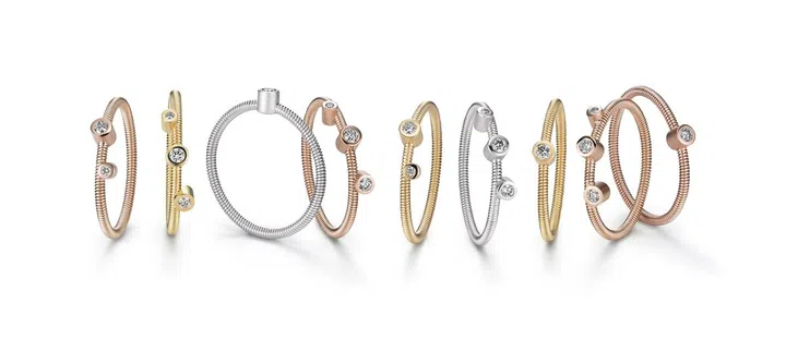 Inspired by the concept of coils, these gold or platinum bracelets may come accentuated with a diamond, and can be worn solo or stacked. Available as rings and earrings too.