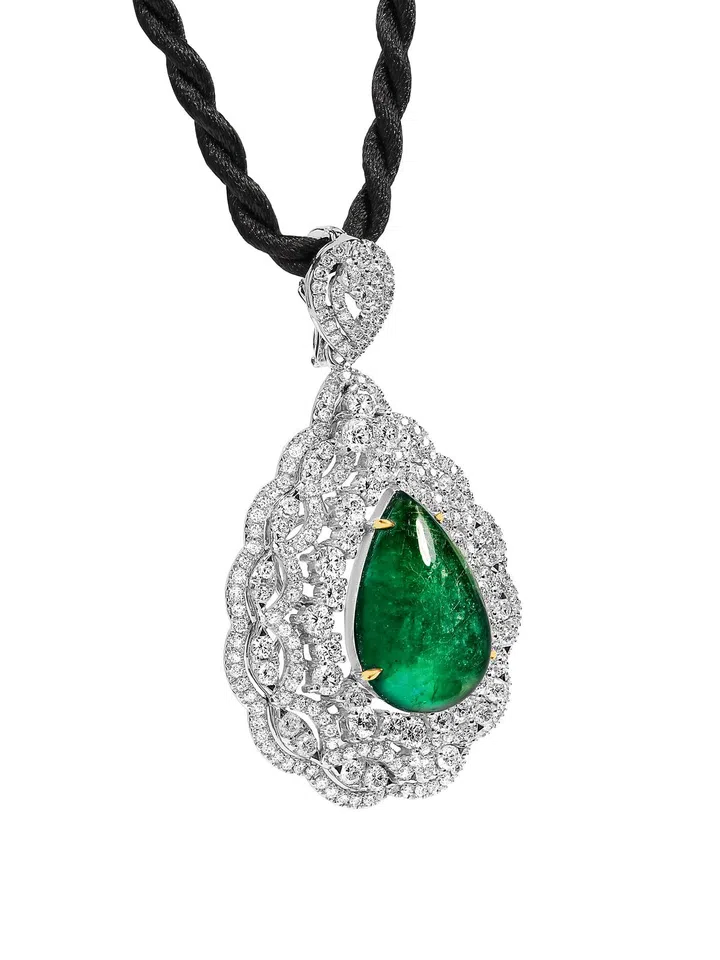 This stunning pendant ($107,160) in 18k white gold is set with 222 flawless diamonds and one dazzling oval-cut emerald gemstone. This rare and infinitely desirable emerald comes from Zambia, the world’s largest emerald mine.