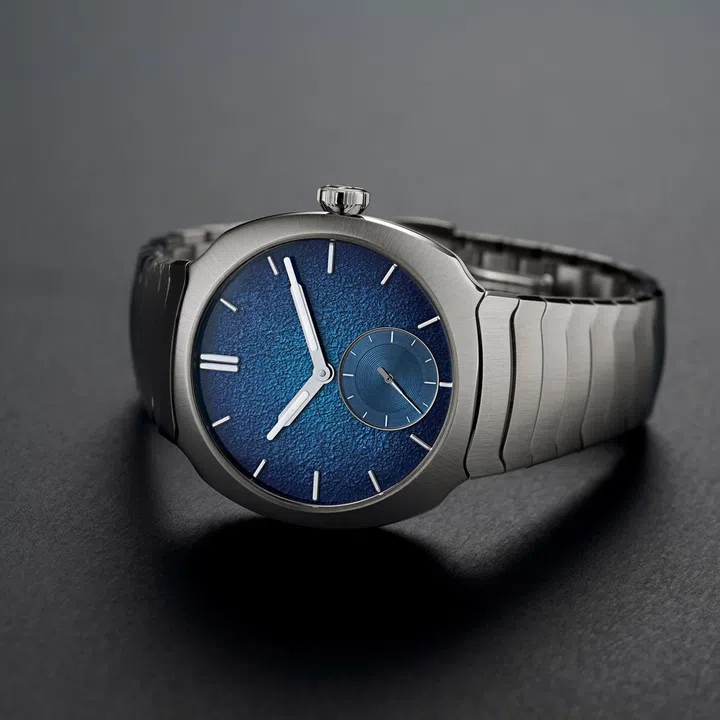 Crafted from stainless steel, the 39mm cushion-shaped case of this H. Moser & Cie Streamliner Small Seconds Blue Enamel draws inspiration from the curved, streamlined aesthetics of the first high-speed trains of the 1920s and 30s. Its proportions have been refined, offering more elongated lines made possible by the smaller dimensions of the new calibre HMC 500. The integrated steel bracelet, elegantly arced, seamlessly extends the curves of the case for a cohesive design. It is also water-resistant to 120m.
