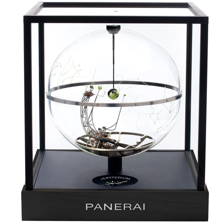 Beneath the rotating constellations on a mahogany base, a black dial echoes Panerai’s marine instruments: luminescent numerals, a 40-day linear power reserve gauge, and the perpetual calendar indicating day, date, month, and year arranged in a linear display. More than a clock, the Jupiterium is a mechanical cosmos where the great Galileo’s stars still turn.