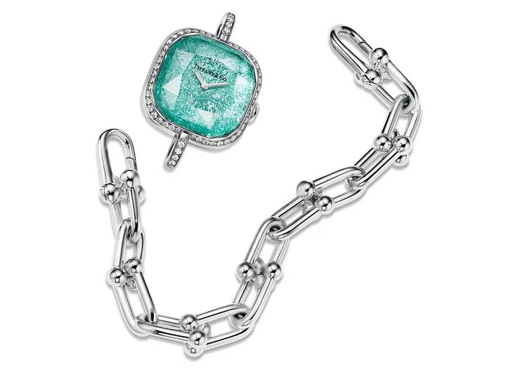 HardWear by Tiffany watch with stainless steel case, sterling silver bracelet, and Tiffany Blue "crush" lacquered dial (Photo: Tiffany & Co.)