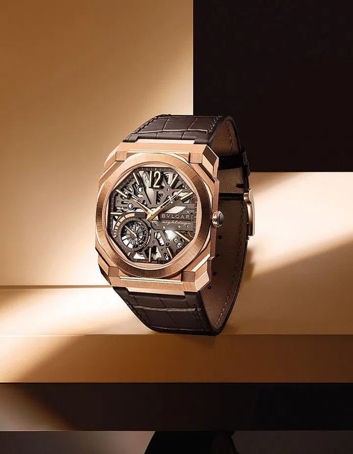 An openworked dial puts the new movement, Calibre BVL 199 SK, on clear display. With its bevelled PVD anthracite bridges, the latest skeletonised movement in the Octo Finissimo family takes on a more architectural and refined aesthetic than previous models. Furthermore, it has an impressive power reserve of eight days — almost thrice that of its openworked predecessor — with a case that is just marginally thicker at 5.95mm (versus 5.15mm).