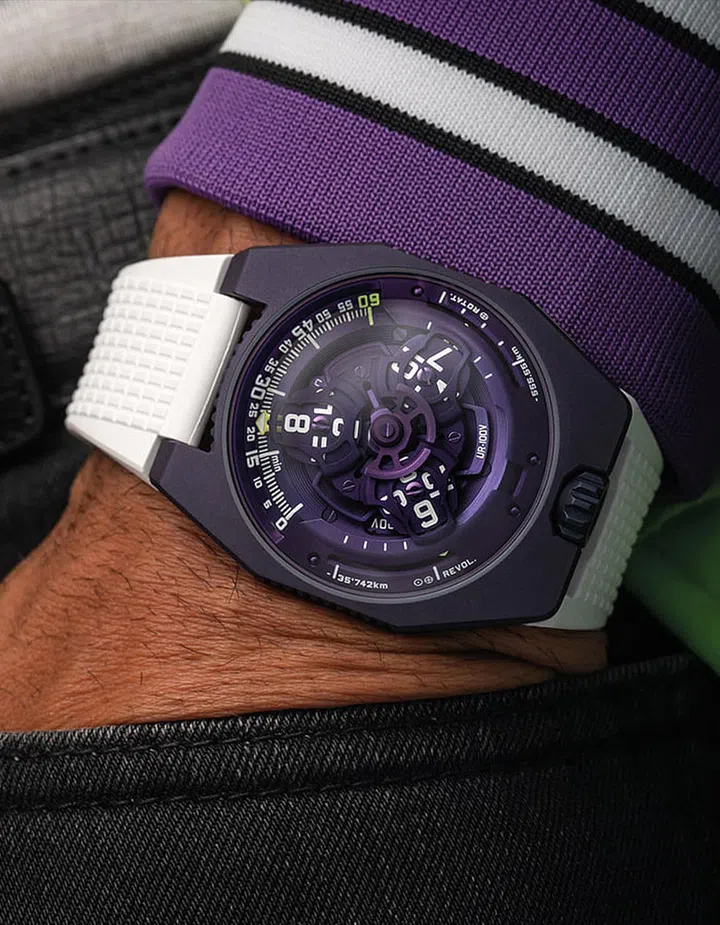Introduced in 2019, the UR-100 has become a Urwerk bestseller as the indie brand’s most affordable (relatively speaking) and wearable timepiece. Its latest iteration sees much of the watch, including its titanium case, coloured a bold purple. In the press notes, the reason for this choice is that violet is “located at the far end of the visible colour spectrum perceptible to the human eye”. The UR-100V UltraViolet also features a new Calibre 12.02, with a redesigned central carousel, which places the hour marker closer to the minutes scale to make it that much easier to read the time.