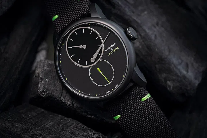 Since he first joined Louis Erard in 2019 as a strategist, Manuel Emch — a former CEO of Jaquet Droz and RJ-Romain Jerome — has invited top names in horology and design to put their spin on the brand’s regulator timepiece. Its latest collaborator is Label Noir, a Geneva-based atelier specialising in watch customisation. The company has created a striking timepiece using different black finishes: The hour subdial at 12 o’clock features a glossy black finish, while the rest of the dial is vertically brushed. The 42-mm steel case itself has a matte black PVD coating.