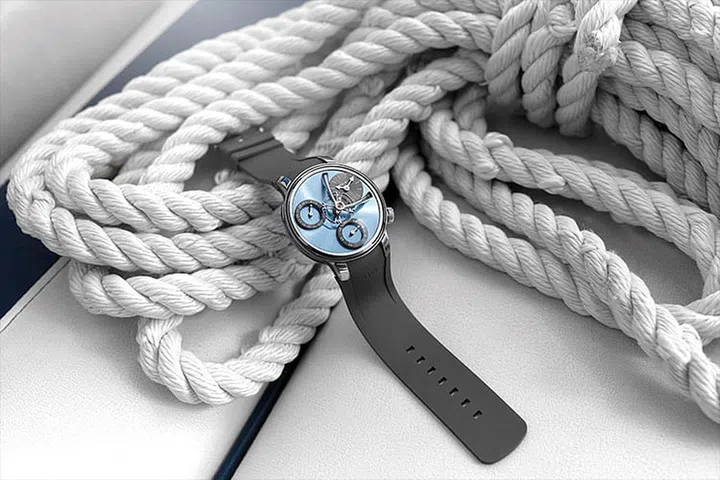 At Geneva Watch Days, MB&F unveiled the latest additions to the EVO family: a pair of LM Split Escapement EVO models. Both housed in 44-mm cases made of Grade 5 titanium, one is a regular- production model with an ice-blue dial, while the other is a 25-piece Beverly Hills edition for the MB&F Lab managed by American watch retailer Westime.