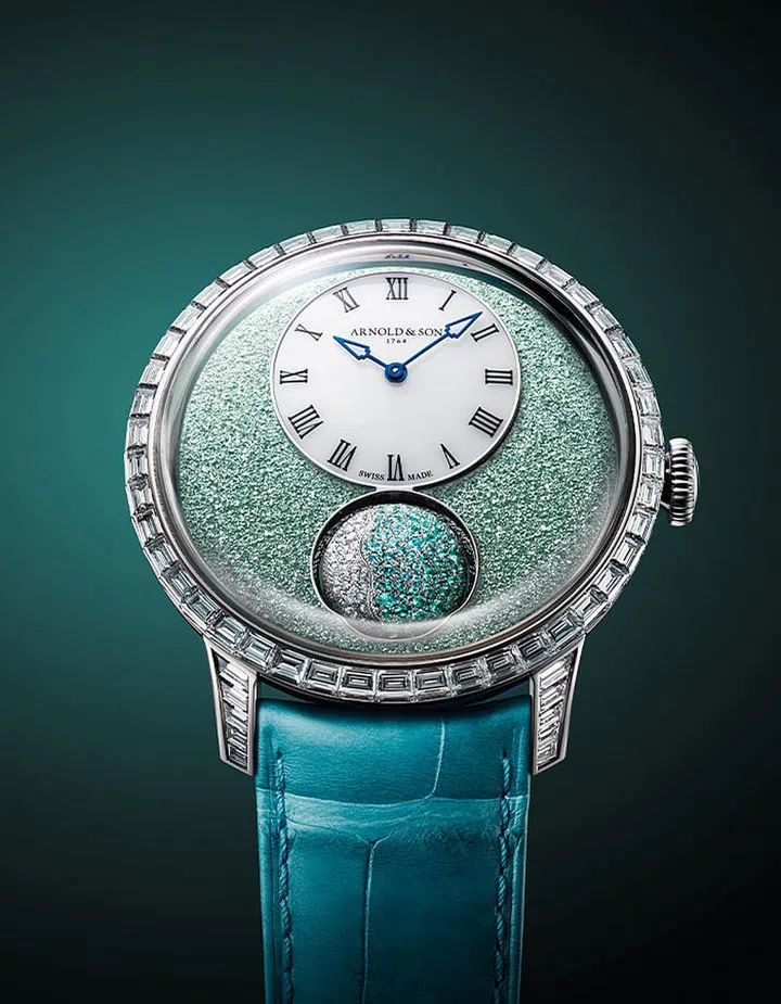 Turquoise is an immensely popular hue in watchmaking right now, but Arnold & Son might be the first to use Paraiba tourmaline and ruthenium crystals to capture the colour’s blue-green shades on a dial. Positioned at 6 o’clock, the 12-mm lunar sphere in the 44-mm white gold Luna Magna Ultimate II is crafted from white gold, and set with 161 diamonds and 161 Paraiba tourmalines. The rest of the dial shines with ruthenium crystals that possess a blue-green hue, thanks to a PVD treatment.