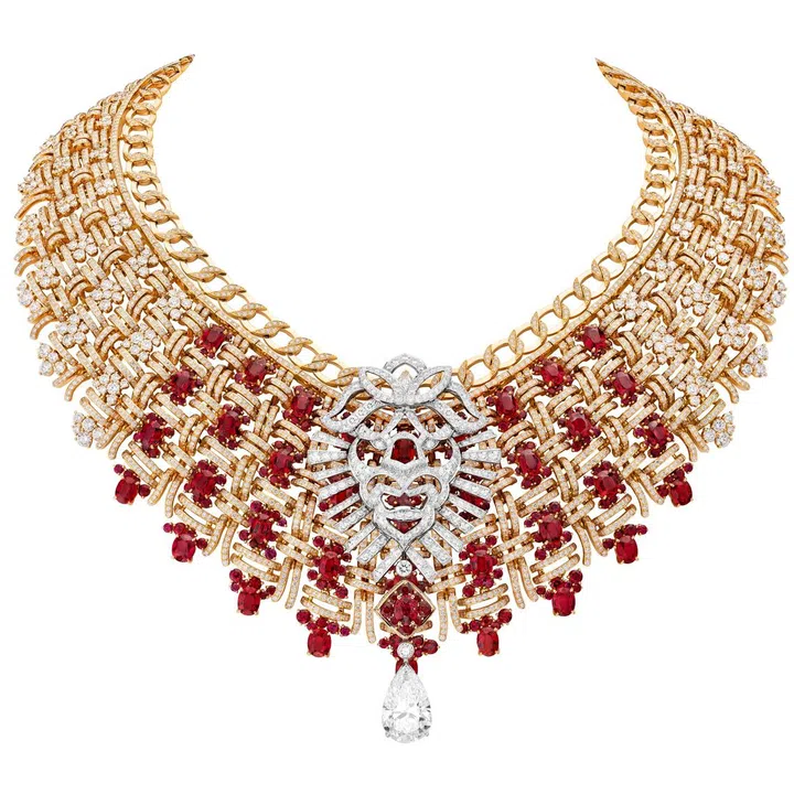 The transformable Tweed Royal necklace, in rubies and diamonds, features the mighty lion motif