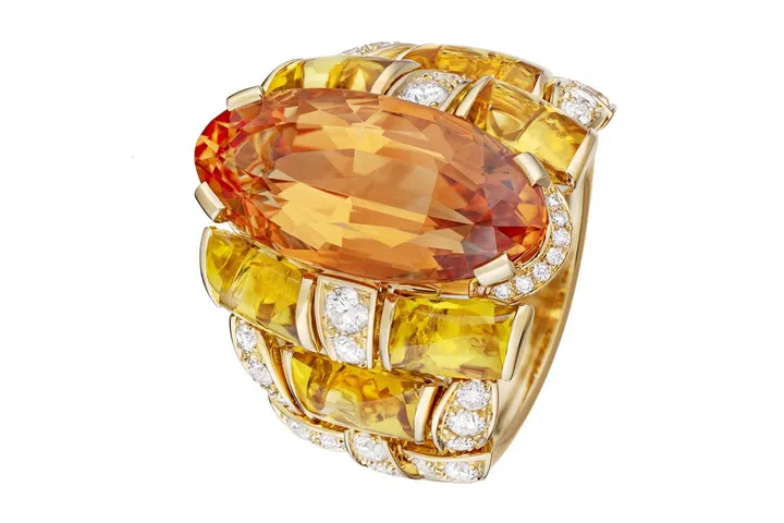 Radiating the resplendence of the sun is this Tweed Soleil ring adorned with diamonds, topaz, and beryls