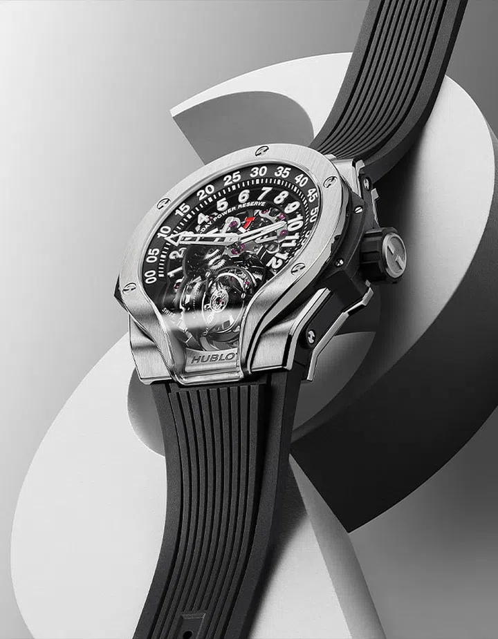 More is more, or at least that’s the case when we are talking about Hublot’s statement Masterpiece (MP) models. The latest in this series is the MP-13 Tourbillon Bi-Axis Retrograde, which boasts two retrograde displays — one for the minutes and one for the hours. Adding even more dynamism is the double-axis tourbillon at the bottom of the dial. Despite the energy needed to power the retrograde displays and the tourbillon, the titanium timepiece features a robust power reserve of 96 hours.