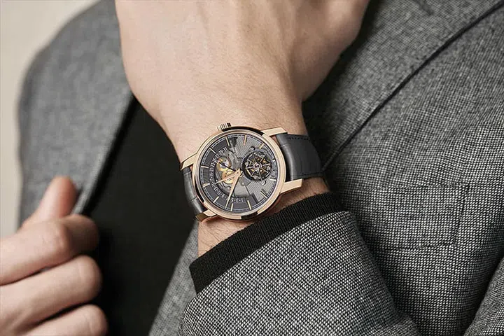 This year, Vacheron Constantin spotlights the retrograde display. Three of its new releases feature a retrograde date, where the date indicator travels along an arc and jumps back to the start of the scale at the end of each month. The most avant-garde of the trio is the Traditionnelle Tourbillon Retrograde Date Openface, which combines a retrograde date with a tourbillon and an open dial. The open dial of this self-winding, pink-gold timepiece lets the brand showcase various finishings — including hand-guilloche on the upper part of the dial and a grey NAC surface finishing on the 2162 R31 movement.