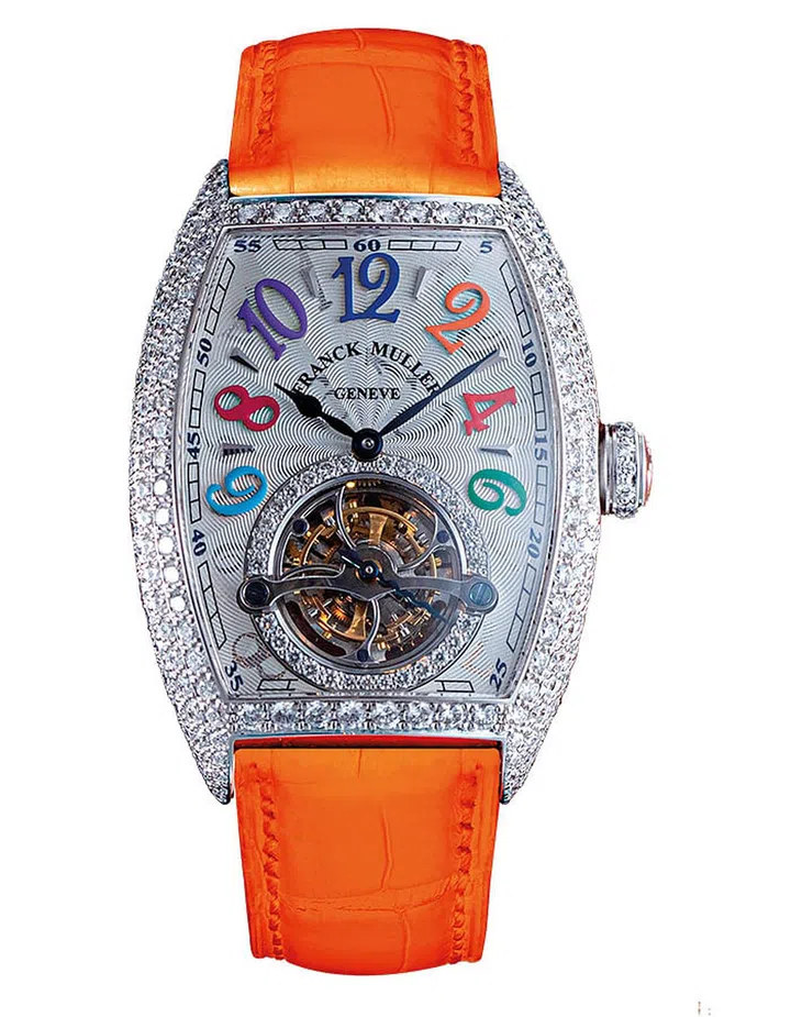 There is a lot going on in the Franck Muller Cintree Curvex Retrograde Hour Tourbillon, but somehow, it all works well together. A retrograde hour display takes pride of place within a white gold case measuring just 30.3mm by 42.25mm: As six o’clock approaches, the hour hand jumps from the right end of the hour scale back to the numeral six at the beginning of the scale. Other features hold their own admirably; these include a tourbillon, the brand’s multi-hued Colour Dreams numerals, a stamped guilloche dial, and 205 brilliant-cut diamonds on the case and dial.