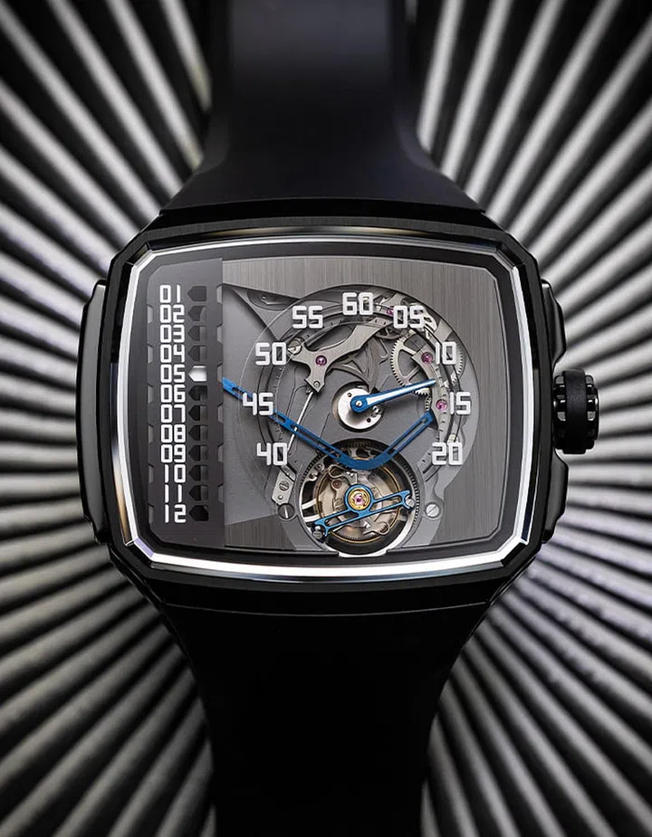 Typically, retrograde displays feature an arced scale. Independent brand Hautlence takes a different path with the linear retrograde jumping hour of its Linear Series 2 watch. Housed in a TV-shaped, black PVD-coated steel case, the dial features a graduated linear scale that evokes those of precision measuring instruments. Through the open dial, you can view the blue skeletonised linkage that drives the jumping hour indicator, which moves instantly from the numeral 12 at the bottom to one at the top when one o’clock rolls around.
