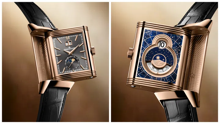 The true marvel lies on the reverse: a handcrafted night-blue enamel dial adorned with 70 pink gold stars, requiring 10 hours of laborious work. Two overlapping apertures form a figure-eight display — the upper with a semi-jumping digital hour, the lower with a rotating minutes disc beneath a star-speckled blue lacquer. A central day/night indicator with guilloche sunrays and laser-engraved coordinates completes this celestial tribute to the Reverso’s enduring legacy.