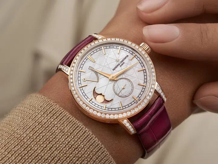 The dial’s distinctive motif, which is used across all the commemorative Traditionelle and Patrimony this year, is a reinterpretation of Vacheron Constantin’s Maltese cross emblem — through a geometric guilloche pattern that plays with light.