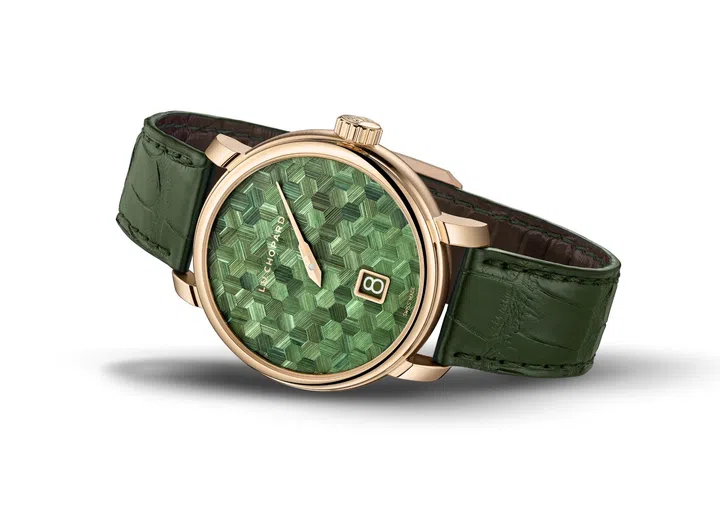 One of the most covetable in the latest L.U.C line-up is this artistic rendition of the Quattro Spirit 25. An eight-piece limited edition, it is presented in a 40mm ethical rose gold case with a stunning straw marquetry dial — a first for the L.U.C collection — crafted using 17th-century techniques. Burgundy rye straw is hand-dyed green, meticulously split, flattened, and cut into tiny hexagons before being assembled in a honeycomb pattern on a rose gold base, creating depth and texture.