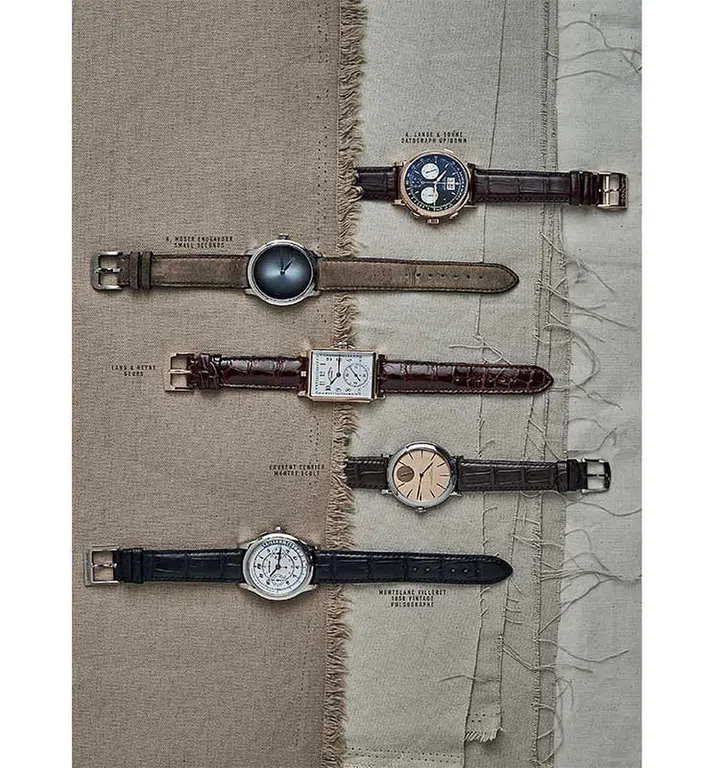 Top to bottom: A. Lange & Sohne Datograph Up/Down, H. Moser Endeavour Small Seconds, Lang & Heyne Georg, Laurent Ferrier Montre Ecole, Montblanc Villeret 1858 Vintage Pulsographe
