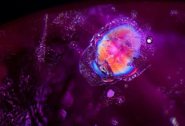 A small melted crystal and associated thin film inclusion dazzle with colour when lit with fibre optic illumination on a Thai/Cambodian ruby (Photo: E. Billie Hughes/Lotus Gemology)