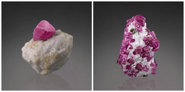 From left: Ruby on marble from Burma, and a cluster of rubies from Greenland (Photos: Ronnakorn Manorotkul/Lotus Gemology)