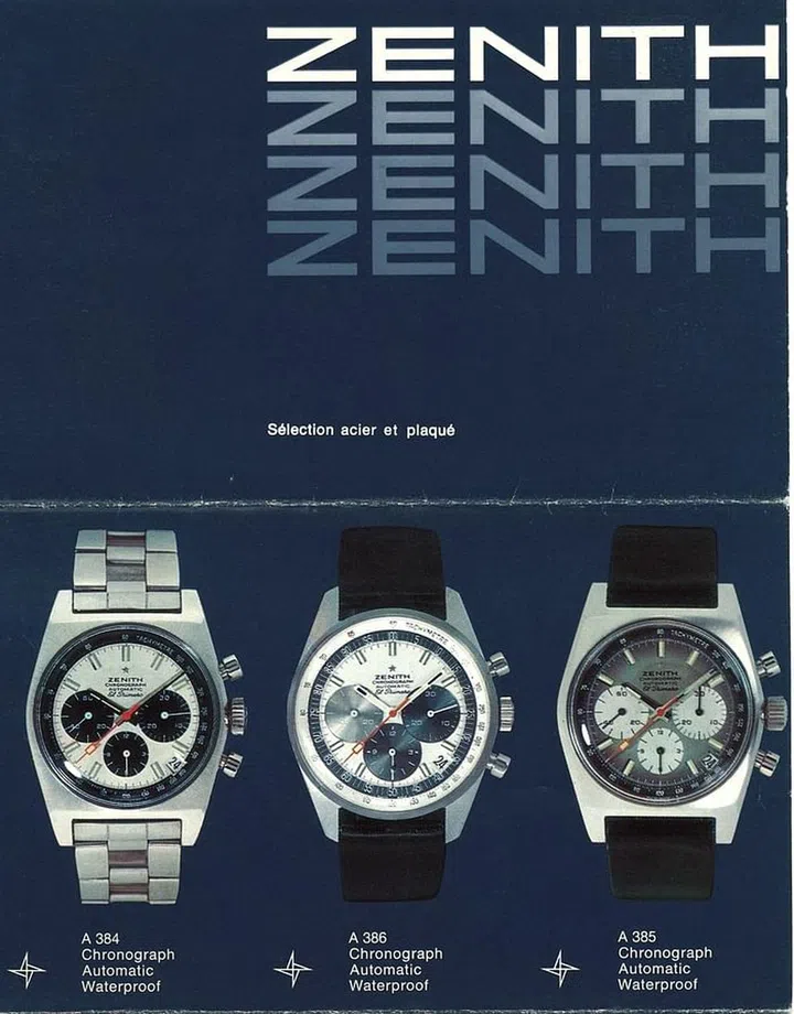 A Zenith brochure showing the three El Primero movement-powered steel watches that were launched in 1969.